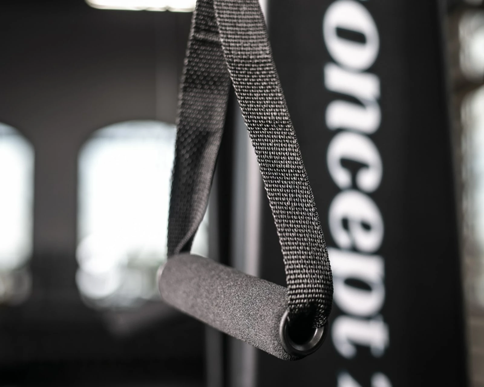 Designed specifically for use with the Concept 2 SkiErg—an industry leading Nordic skiing machine—the extension kit features (2) polypropylene webbing straps with a loop on one end and a handle on the other. The loops cinch around the bottom of the existing SkiErg grips, while the adjustable handle portion of the straps hang down to a max extension length of 28″ from the standard grips. Each 1.125″ (handle) diameter handle includes a foam outer layer for comfort, and can be easily tightened/loosened so that athletes with limited dexterity can still pull the device with little to no grip strength required.