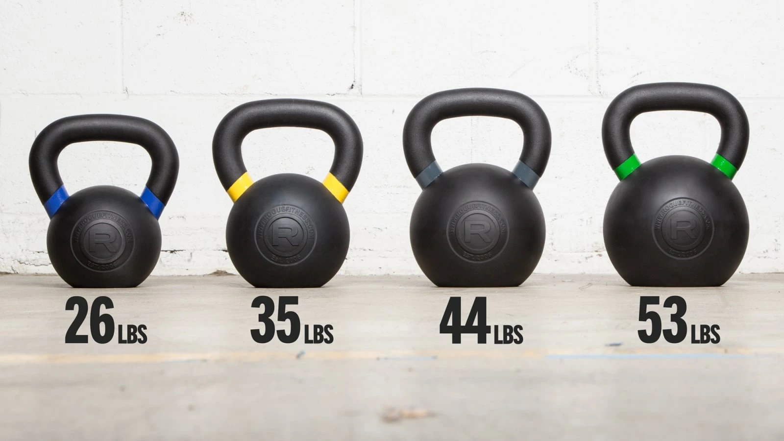 Rogue Rubber Coated Kettlebells are available in five weight increments (26LB, 35LB, 44LB, 53LB, 70LB) and feature a single-piece casting, wide flat machined base, and color-coded handles with a textured, powdercoat finish. The black urethane exterior coating includes exclusive Rogue branding with the “R” logo.